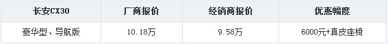 价格波动情况:CX30上市以来,销量一直不错。现购车优惠6000元并送真皮座椅,感兴趣的朋友可以考虑出手了。