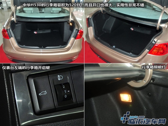 中华H530全系标配双安全气囊,ABS+EBD,EBA/BAS刹车辅助和倒车雷达。1.6 MT/AT豪华型两款车型配有前排侧气囊和LATCH儿童座椅接口。中华H530全系标配行车电脑显示屏、后视镜电动调节和USB/iPod外接插口。1.6 MT/AT豪华型两款车型配有真皮方向盘、电动天窗、后视镜加热和时下非常流行的无匙启动系统。