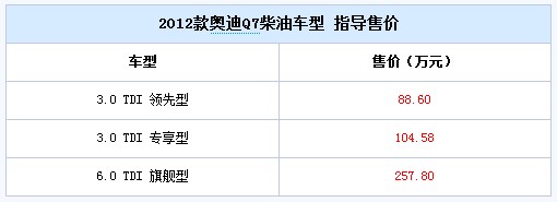 日前,一汽-大众奥迪官方宣布,2012款奥迪Q7柴油车型上市。此次上市的2012款奥迪Q7针对内饰和配置进行了部分升级,柴油车型包括2个排量3款车型,售价区间为88.6-257.8万元。详细售价请见下表:
