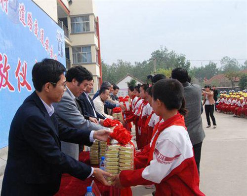 为配合中央文明办、公安部联合开展的文明交通行动计划,倡导文明交通出行,平安出行, 10月12日上午,中国道路交通安全协会和山东省道路交通安全协会联手开展向沂蒙山区中小学生送安全公益活动。来自中国道路交通安全协会、山东省道路交通安全协会、市公安局交警支队、沂南县县委县政府、沂南县教育局等领导出席了捐赠仪式。