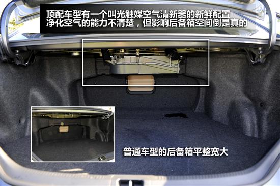 后备箱及车内储物空间方面新车在老车的基础上进行了一定的优化,前门储物格的实用性有所下降,后排车门储物格的实用性有所提升,副驾驶扶手箱的实用性提升,但有点儿影响副驾驶的腿部空间,中央扶手箱取消了之前的双层设计,这点有些遗憾。后备箱平整宽敞,但顶配车型由于安装了一个叫“光触媒空气清新器”的设备,实用性受到很大的影响,而这个设备主要是为了提升车内空气质量,据说同级别的竞品车型都未装配,具体效果有待进一步考证。