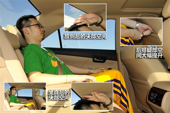 而新车的头部空间也得到了一定的优化,在不破坏车身强度的情况下,前后车顶都采用了内凹的设计,身高180cm的模特头部尚有接近一拳的余量,而后排的情况还要略好于前排,这点比老车强了不少。另外中高配车型的后排靠背可以调节角度,这点在同级车中非常少见,后排乘客很容易就能找到一个更舒服的位置,这点比近期上市的某加长车型那个接近直角的后排座椅强了很多。