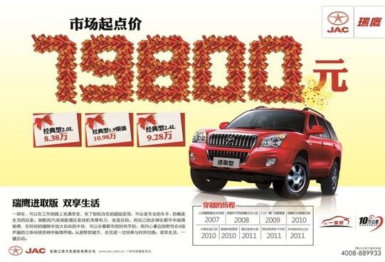 新浪汽车讯 2月1日起,江淮将推出瑞鹰进取型,市场售价为7.98万元,并同期调整瑞鹰经典型两驱2.0L到8.35万元,经典型两驱柴油1.9T到10.98万元,经典型两驱2.4L到9.25万元。
