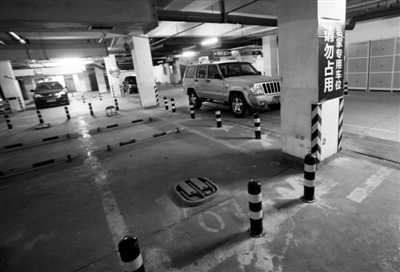 2月27日,沿海赛洛城一期地下停车场的停车位已装上地锁和路桩,一些车辆只能停在通道上。