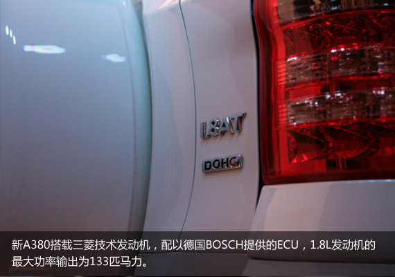 新A380搭载三菱技术发动机,配以德国BOSCH提供的ECU,1.8L发动机的最大功率输出为133匹马力。同时,新车还采用了高端车型上常使用的DOHC技术,有效实现了整车燃油经济性,百公里油耗仅8.0L。