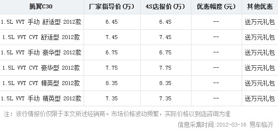降价原因分析: 腾翼C30自上市以来价格浮动不大,现购车将享受大幅优惠,中意该车型的朋友不妨抓住机会入手。