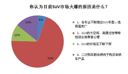 通过调查我们发现,有七成的消费者认为SUV的大空间、高通过性等特性是当前SUV市场火爆的主要原因,另外有10%的人认为是由于SUV价格的不断下探导致。