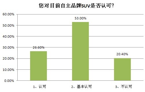 调查显示,对于自主品牌SUV,有26.6%的网民表示认可,53%的网民表示基本认可,而表示不认可的占20.4%。从中不难看出,大多数网友对于自主SUV基本还是持认可态度的。