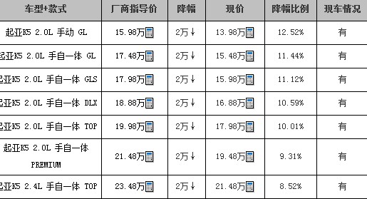 编者建议:起亚K5造型时尚动感,曾获得德国红点设计大奖,性价比也很高。2012款K5上市后,2011款价格出现大幅跳水,近期2000元的现金优惠幅度很大,感兴趣的朋友不要错过机会。