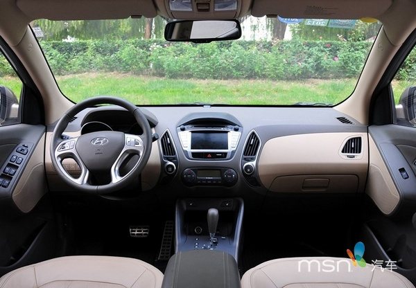 ix35的内饰延续了外观设计的特点。整个中控台部分呈“X”造型,与束状出风口搭配的非常和谐,极富前卫感,并且个性的设计也没有影响其实用性的表现。不过虽然造型新颖,但内饰用料方面还有待提高。