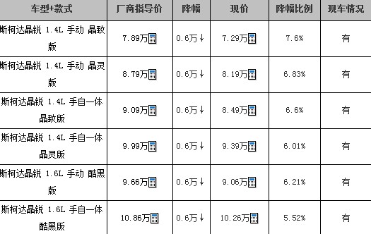 斯柯达晶锐现金优惠6千元现车充足