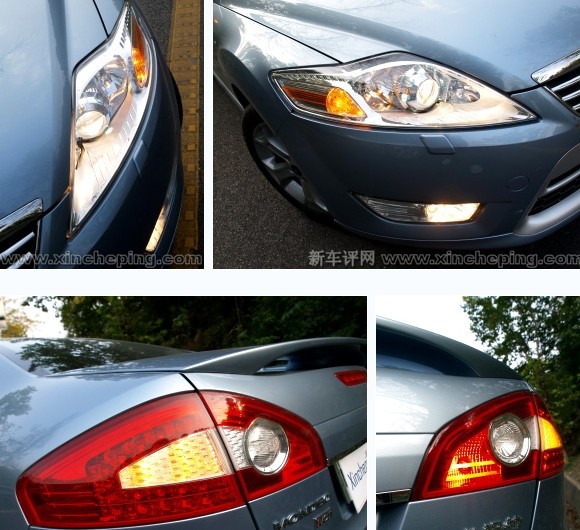 车灯是一部车的眼睛,在蒙迪欧上,福特给它打造了绚丽的眼睛。车灯轮廓保持了概念车iosis的设计,与强调科技感的概念车不同,量产的蒙迪欧车灯做工极尽豪华、精致之能事。大灯内衬大量采用镀铬,运动豪华型还有自动水平调节的HID氙气灯泡、弯道辅助照明灯;尾灯拥有阿士顿马汀风格的蜂窝式LED灯泡,跑车化的扁平造型也跳出了同级车的固有模式。