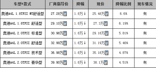 编辑点评:奥迪A4L有1.8TFSI和2.0TFSI两种排量,目前现车较全并且优惠力度较大的是2.0TFSI车型。考虑到动力性和配置,笔者推荐大家关注下A4L 2.0TFSI车型。