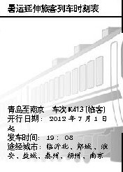 据悉,2012年暑期运输期限自7月1日起至8月31日止,为应对暑期旅游流和学生客流大量涌现带来的客运压力,经我市地方铁路局、临沂车务段等部门积极申请,自7月1日起,我市将新增旅客列车6列。其中,新增始发旅客列车2列,分别是临沂至北京,临沂至济南;过路旅客列车4列,分别是烟台至重庆、烟台至成都、日照至济南、日照至西安。此外,青岛经我市至扬州的旅客列车也将延伸至南京。