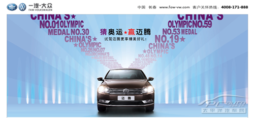 2012年的夏天激情四射,好戏连台-------欧洲杯的硝烟刚刚散去,伦敦奥运会又战火重燃。为预祝中国奥运健儿取得更好的成绩,一汽-大众特举办“猜奥运赢迈腾”活动,尊享5重豪礼。