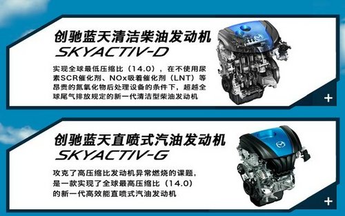 创驰蓝天的汽油发动机SKYACTIV-G发动机入选了沃德十佳发动机,马自达2.0排量SKYACTIV-G发动机首次在普通民用车上实现了高达14:1的汽油机压缩比,引入国内后根据实际情况压缩比调整为13:1。