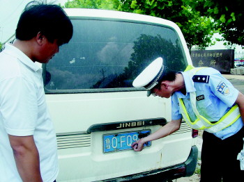 执勤民警在检查车牌号。