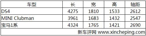 DS虽然针对个性用户,但实际上它的块头大小适中,尺寸还比较规矩,比加长版的MINI Clubman还大,而比宝马1系略小。