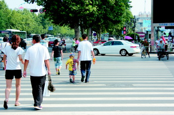 6日下午2时30分,市区室外温度约为32度,记者沿着金雀山路向西走到与沂州路交会路口,此时正好是南北方向的红灯。在红灯还剩30秒的时候,等在路南的6名行人便迎着红灯闯了过去。