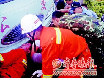救援人员将手伸进车底,双手托着孩子的整个身体,慢慢把孩子托出送上急救车。