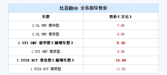 10月9日,比亚迪官方宣布,G6周年纪念版车型正式上市。此次上市的新车为6款车型,售价区间为7.98-11.58万元。详细售价请见下表: