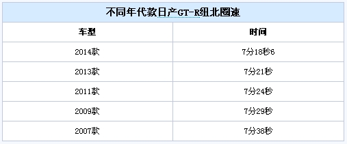 作为参考,2013款GT-R的成绩为7分21秒,2009款GT-R的成绩为7分29秒。而和2007款最早的GT-R R35相比,2014款GT-R纽北圈速成绩提高近20秒(2007款的成绩为7分38秒)。可以说,GT-R在用不断的进化,来诠释着经典。