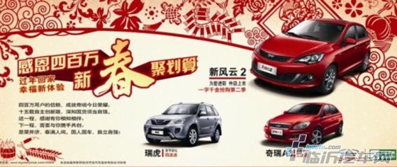 【临沂网汽车】年终岁末,圣诞、新年、春节一个个温馨浪漫、其乐融融的节日接踵而至。为庆祝奇瑞汽车全球销量突破400万辆,自2012年12月1日起,临沂奇瑞汽车为感恩回馈广大顾客,特推出“感恩四百万 新春聚划算”大型促销活动。届时,奇瑞A3也同步推出新春购车三连送活动,突破万元的惠民礼、导航礼、装饰礼件件贴心,连环相送。