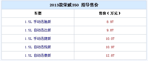 【临沂网汽车】 近日,上汽荣威公布了2013款荣威350的售价,新车共计5款,售价区间为8.97万-12.87万元。