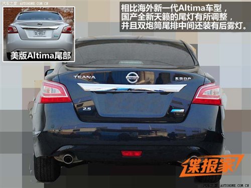 东风日产全新天籁的原型车为已在北美市场推出的新一代Altima,只是细节部分,东风日产对全新天籁进行了调整,比如前大灯内部灯组结构看上去更为一体化,车身加入了镀铬装饰条,尾灯也有所变化,双炮筒尾排中间还安装了后雾灯(和现款相同)。