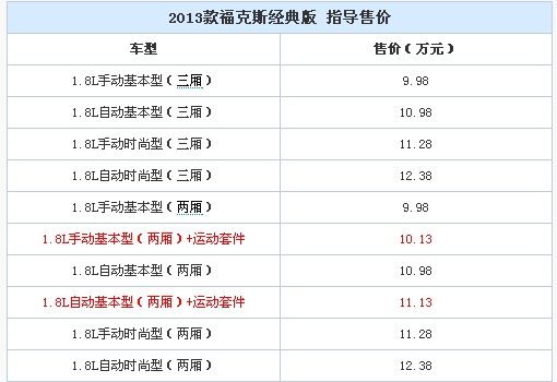 【临沂网汽车】近日,我们获得了2013款福克斯经典版车型的售价。相比现款车型,新车的车款数量有所增加,而售价区间依旧为9.98万-12.38万元。