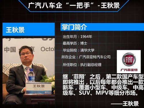 王秋景拥有清华大学汽车工程博士,以前是南汽集团的副总,上南整合后到了广汽集团,相信广汽集团将他安排到广汽菲亚特还是有目的的,他不仅了解菲亚特乃至意大利文化,同时还有以前意大利菲亚特和原南京菲亚特方面的不少人脉资源可以利用,但在南汽集团内部,他也没有独自掌舵一个企业的经历。