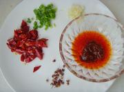 2. 干辣椒去籽切段、小葱切葱花、蒜切碎末;郫县豆瓣酱、辣椒碎、辣椒油混合备用。