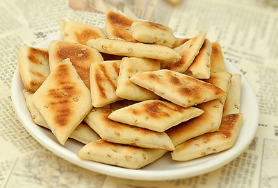 6. 电饼铛接通电源,调为小火,饧发好的菱形块放上去。一面成型后,翻面,直至煎至两面金黄,口感酥脆即可。依次把所有的抓果烙完,凉晾后会更加的香脆。如一次性吃不完,凉晾后用保鲜袋密封好保存,不易受潮。
