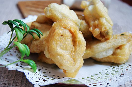 13. 菠菜脯炸至杏黄色,捞出控油装盘即成。