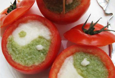 做 法: 1. 将山药和青豆蒸熟,分别捣成山药泥和青豆泥; 2. 在山药泥和青豆泥里分别调入黄油、白糖和少许的牛奶,拌匀; 3. 西红柿切去盖,里面掏空。先把山药泥装至9分满,再用青豆泥在山药泥的上面薄薄的抹一层鱼状的图案,与山药泥形成对称的太极图案。