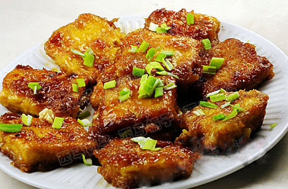 2、“锅塌”是山东菜独有的一种烹调方法,它可做鱼,也可做肉,还可做豆腐和蔬菜。锅塌豆腐著名山东菜,成菜呈深黄色,外形整齐,入口鲜香,营养丰富。此菜原料层层叠起豆腐经过调料浸渍,蘸蛋液经油煎,加以鸡汤微火塌制,十分入味,豆腐蛋白质丰富,其生理价值比其他植物蛋白质高,可与肉类蛋白质媲美;含钙量也高,且易于吸收;虾子富含钙、磷等,有助于促进骨骼、牙齿、大脑等生长发育,并增强抵抗力,防止佝偻病、肌肉松弛等。