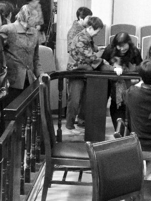 当老夫妻被法警带离现场时,来旁听的儿媳失声痛哭,向公公婆婆下跪。现代快报记者 马薇薇 摄