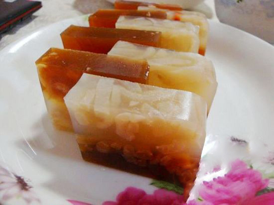 猪皮是人们吃得最多的~类,最经典的大众吃法就是猪皮冻。只要将肉皮处理干净,切成丝,放入料酒和料包熬2小时左右至肉皮熟透、汤汁浓稠,然后加入盐、糖调味,倒入容器中放凉凝固即可。