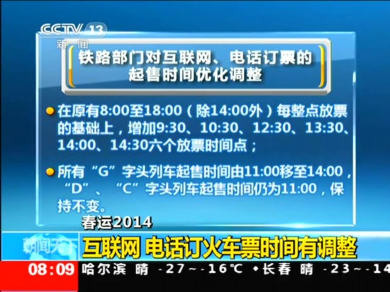 此次调整,在原有8:00至18:00(除14:00外)每整点放票的基础上,增加9:30、10:30、12:30、13:30、14:00、14:30六个放票时间点;二是所有“G”字头列车起售时间由11:00移至14:00,“D”、“C”字头列车起售时间仍为11:00,保持不变。