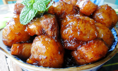 材料:山芋粉半碗 五花肉350克 姜2片 八角1枚 桂皮1枚 白酒1茶匙 盐2茶匙 老抽4茶匙 糖半茶匙