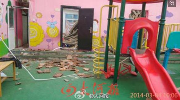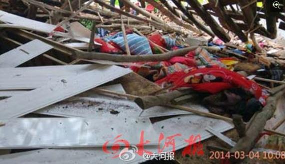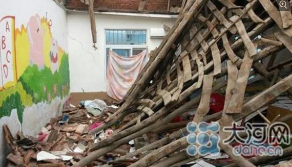 3月4日凌晨1时左右,河南信阳浉河区一乡村幼儿园房顶坍塌,13名全托幼儿被覆没。1名孩子在送往医院的途中死亡,3名孩子受伤,9名孩子无恙。图片来源:大河网