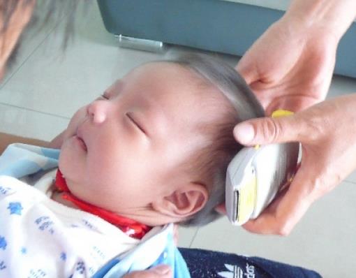 6、对于发丝较硬的宝宝,推子要离宝宝的头皮近一些;对于发丝较软的宝宝,推子要离得相对远一些。总之,不能划到宝宝的头皮。