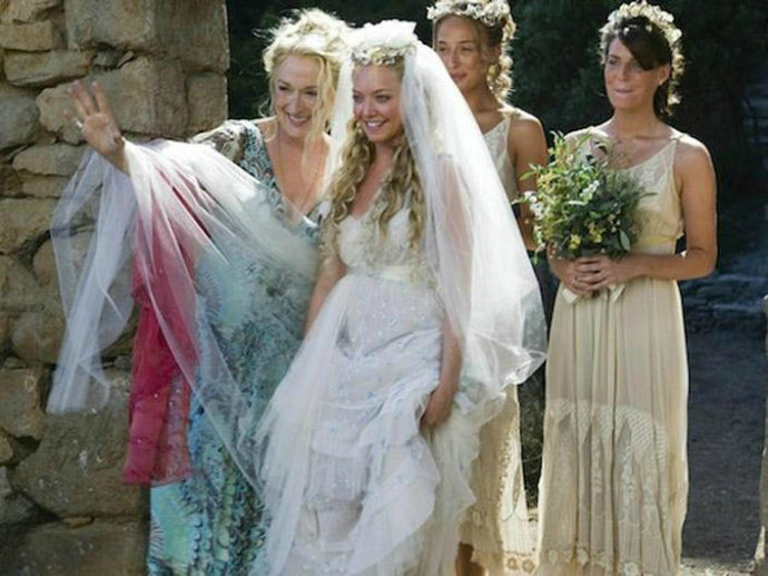 《妈妈咪呀!(MammaMia!)》。纵观Sophie(AmandaSeyfried饰演)的新娘装:鲜花拥簇、珠光宝气、金发卷曲、肌肤黑亮,可见婚礼将至!是在热带岛屿上举办。虽然伴娘和她的母亲(MerylStreep饰演)打扮靓丽,但只有新娘才能hold住全场。