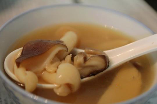 至尊鲜菌汤--菌类一直是女人养颜的心水选,将松茸、金耳、金针菇、竹荪、牛肝菌、杏鲍菇、木耳等菌类汇聚在一盅,以文火慢炖,淡淡的清汤中混有各种菌类的味道,香味来得口感丰富。嫌菌味过重的女性不用担心,此款汤品早有肉类与鸡粉一起熬煮为底料调味,已去味不少。