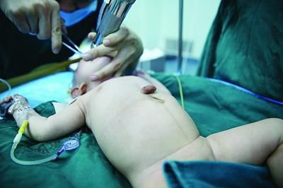 来自安徽含山的女婴露露(化名)出生时,心脏的一部分长在身体外面,挂在肚子上。每天看着宝宝肚子上的肉疙瘩跳动着,家里人也跟着“心惊肉跳”。今年3月20日,南京市儿童医院心胸外科莫绪明团队,为仅2个月大的露露进行了心脏修复手术,不仅将她的“肥大”的心脏塞回了体内;还做了“减肥”,切除了多余的部分;并且进行了心脏其它畸形的修复。手术进行了近4个半小时,其中心脏停跳41分钟。