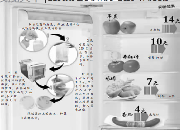 近日,网上一张图片显示,常见的食物在冷藏室内存放,肉类食品最多存5天,蔬菜水果则不能超过两周,否则食物就会变质。这种说法是否正确?记者进行实验证明,网传说法基本正确。相比水果蔬菜,肉类存放在冷藏室内更容易变质,其中鸡肉冷藏一周后细菌超标一万倍。