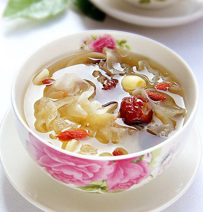 五果冰糖羹:去核红枣5枚切碎,枸杞子10克,桂圆肉15克,同入一锅加水,以文火煮片刻。再将去皮香蕉1条切丁,并与去皮葡萄200克,投入汤羹内拌匀,以冰糖适量调味。空腹食用。