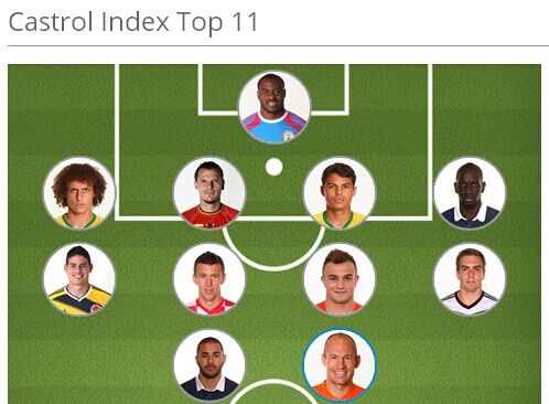 世界杯小组赛最佳阵容:恩亚马(尼日利亚);大卫-路易斯(巴西)、范比滕(比利时)、蒂亚戈-席尔瓦(巴西)、萨科(法国);罗德里格斯(哥伦比亚)、佩里西奇(克罗地亚)、沙奇里(瑞士)和拉姆(德国);罗本(荷兰)、本泽马(法国)