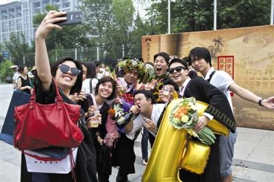 昨日,北大邱德拔体育馆外,毕业生们和亲朋好友合影留念。当天,北京大学举行2014年本科生毕业典礼暨学位授予仪式。摄影/新京报记者 周岗峰