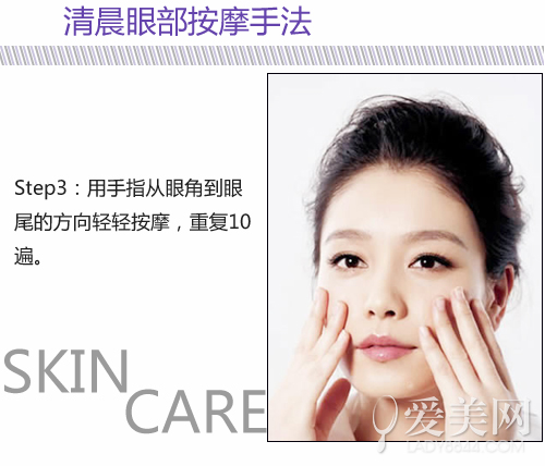 Step3:用手指从眼角到眼尾的方向轻轻按摩,重复10遍,可让眼部肌肤舒缓的同时,眼部不会暗淡无神。